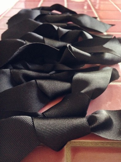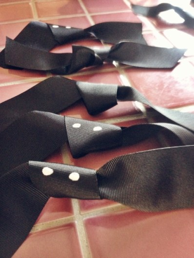 First, buy some 1.5 inch black ribbon and cut it up. I have no idea how long my pieces were. I’d say probably like 9-12 inches. I made them different sizes, but for sure no shorter than 8…or 9. Again, I didn’t measure.